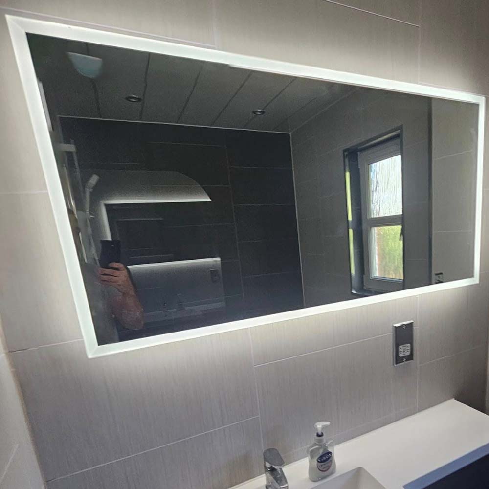 Above, a rectangular LED mirror brings a soft light and a modern lift. On the front wall, a small window lets in just enough natural light, while a polished silver towel heater keeps things warm and tidy. Underfoot, we installed underfloor heating beneath sleek black tiles, bringing consistent warmth to every step and making those early mornings far more comfortable.