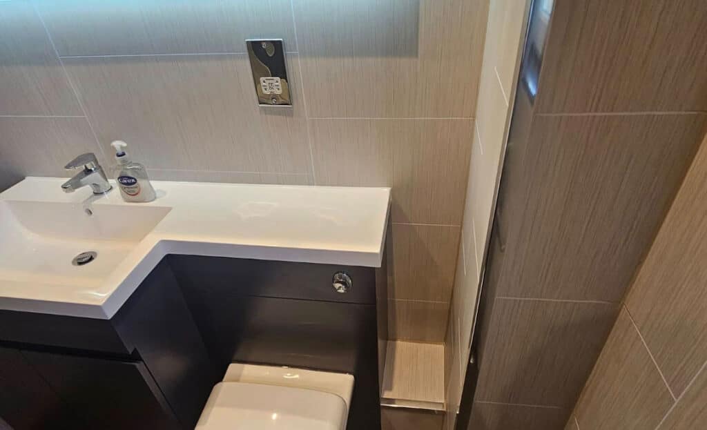The vanity and WC sit together along the left-hand wall, clean-lined and practical, softened by the warm brown tiling that gives the space its overall tone.