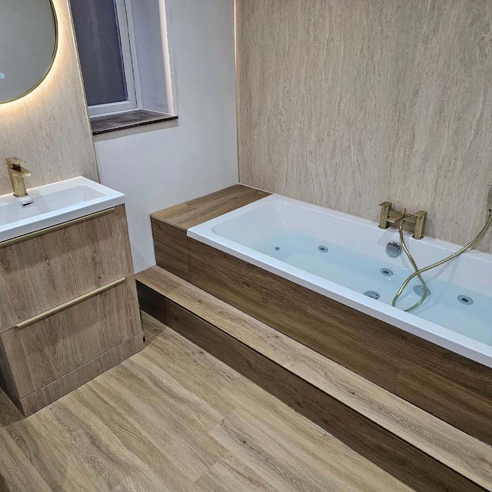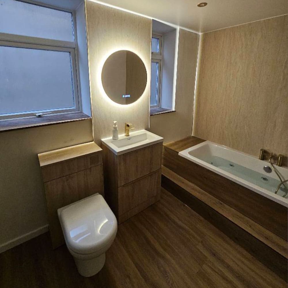 The round LED mirror adds warmth with its glow and helps reflect light into the space. Beside the vanity, the fitted bath is surrounded by matching wooden panelling, which continues across the floor for a natural flow. The gold-toned fixtures complete the look with just the right touch of refinement.