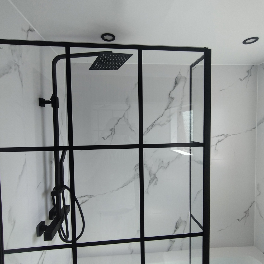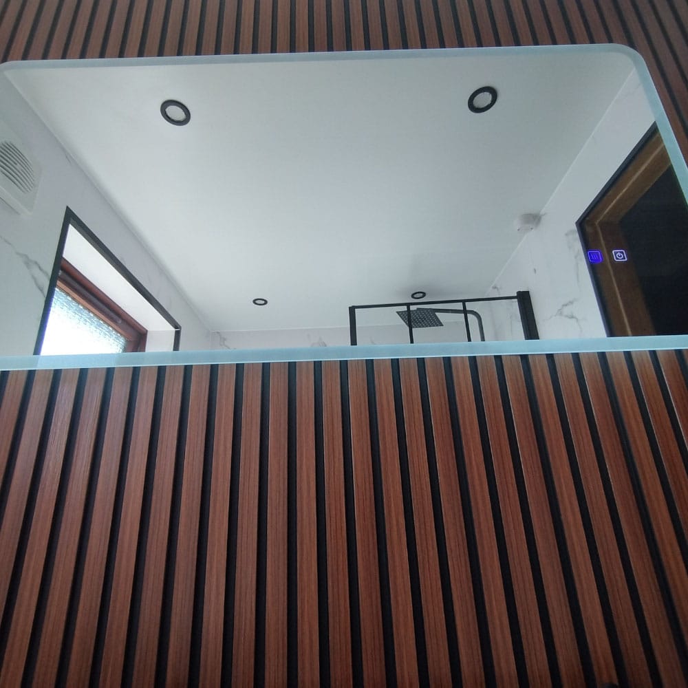 The focus here was to keep things clean but not clinical. We started by dressing the main wall in warm, wood-textured tiles, creating a soft, natural backdrop.