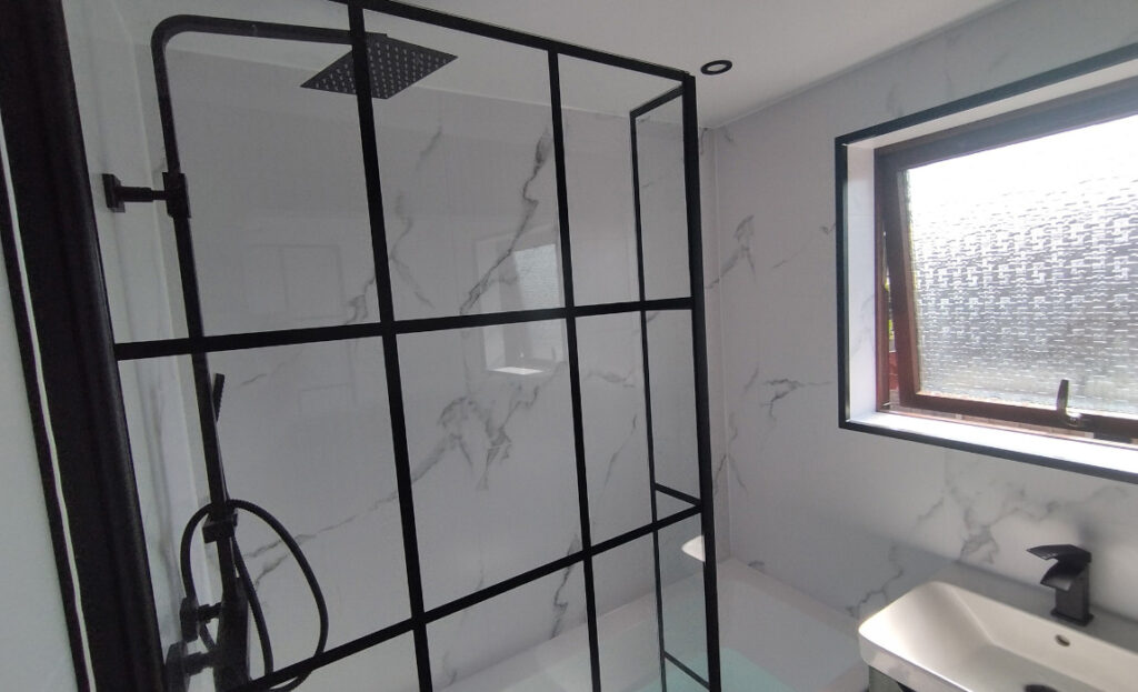 This bathroom was designed with a wetroom layout in mind, offering a fully waterproofed floor and open feel, but with the added comfort of a fitted tub. The clean white wall tiles brighten the space, while black fixtures bring a modern, structured look. By combining the shower and bath within the same open environment, we created a layout that feels generous without being oversized. The flow between each element, tub, and shower was carefully planned to feel effortless and practical, while keeping the overall style calm and understated.