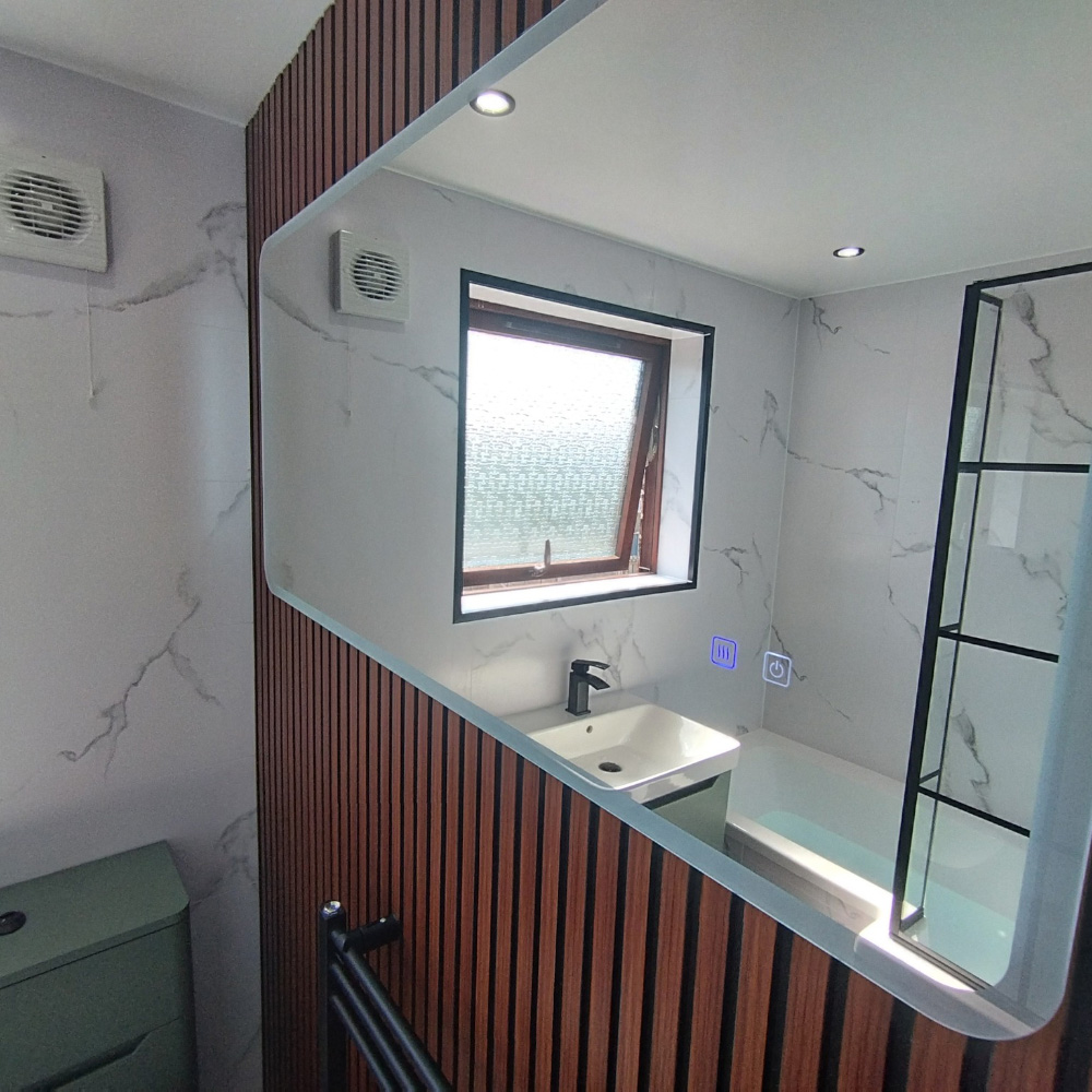 A large LED mirror was added for both function and ambience, giving the space a soft glow, especially in the evenings. The green and white vanity unit brought in a fresh, grounded tone, while the black fixtures added just the right amount of edge. Together, the combination created a compact, stylish basin area that feels both modern and relaxed.